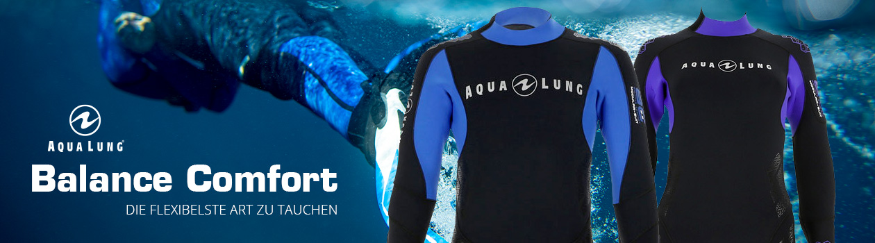 Das modulare System Balance Comfort bestehend aus einem Overall mit 5,5 mm oder 7 mm (Reißverschluss am Rücken), einer Weste mit Front-RV und einer Kopfhaube. Es erlaubt vielfältige Kombinationsmöglichkeiten, damit sich nahezu alle verschiedenen Gewässer angenehm betauchen lassen.