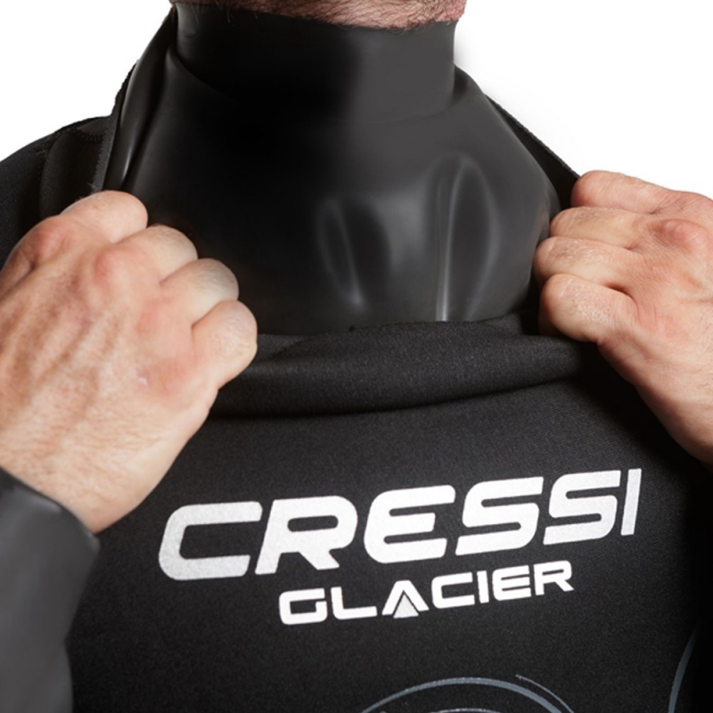 Glacier ist ein 4 mm dicker Trockentauchanzug aus vorkomprimiertem, hochdichtem Soft-Neopren. Dieses Material ist extrem robust und haltbar, dennoch äußerst komfortabel, auch durch die hochflexible Aussenbeschichtung. Der Hals-Kragen und die Arm-Manschetten bestehen bei diesem Modell aus Latex und können dadurch individuell angepasst werden. Der Glacier ist mit einem zweiten, 1,5 mm dicken Neoprenkragen für zusätzlichen Kälteschutz ausgestattet. Schultern, Rücken, Hüfte und Knie sind mit "X-Diamond" - Material verstärkt, extrem abriebfest. Die Füßlinge sind aus weichem und elastischem Neopren gefertigt und sorgen für einen bequemen Sitz. Im Inneren des Trockentauchanzuges befindet sich ein Paar Hosenträger, die den Anzug in geöffnetem Zustand an seinem Platz halten. Der Reißverschluss ist mit einer Neoprenklappe abgedeckt. Das Einlassventil wird über einen seitlichen Knopf aktiviert, das Auslassventil ist einstellbar. Der Glacier verfügt über zwei große Seitentaschen an den Beinen, in denen zusätzliche Ausrüstung verstaut werden kann. Glacier wird mit einer Orust-Neoprenhaube und einem Schlauch zum Aufblasen geliefert.