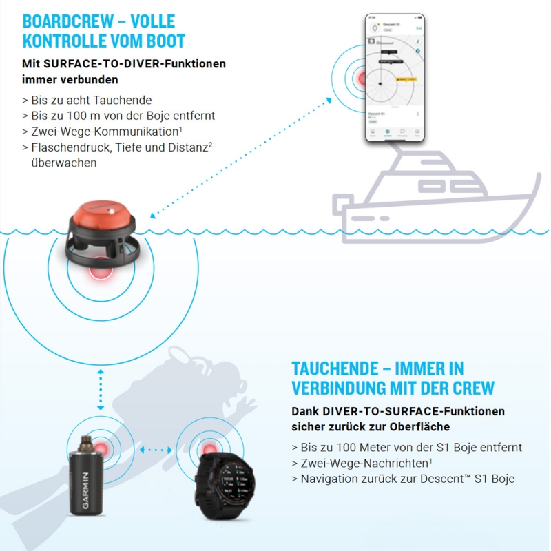 - Perfekt vernetzt – für jedes Tauchabenteuer: Das Garmin Dive Ecosystem verbindet Tauchcomputer, Bojen, Transceiver und die Garmin Dive App zu einer leistungsstarken Einheit. Für Zwei-Wege-Kommunikation, Überwachung, Navigation, Dokumentation in der App – und damit volle Kontrolle über und unter Wasser.