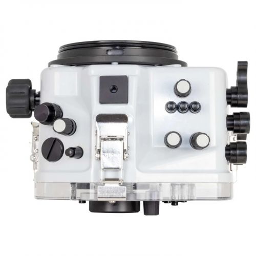 - Für alle wichtigen Kamerafunktionen sind Bedienelemente vorhanden; Bedienelemente für die Dioptrieneinstellung, das hintere Einstellrad und die Moduswahlsperre sind nicht vorhanden. Der Moduswahlschalter muss vor der Installation für die Verwendung unter Wasser entriegelt werden
