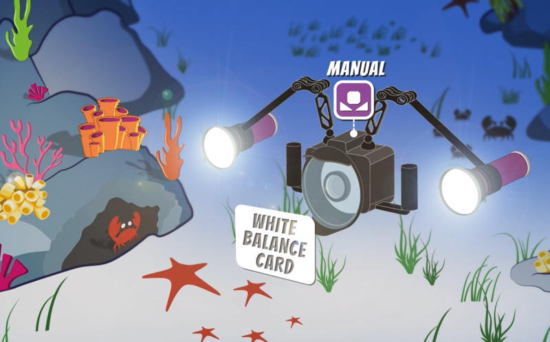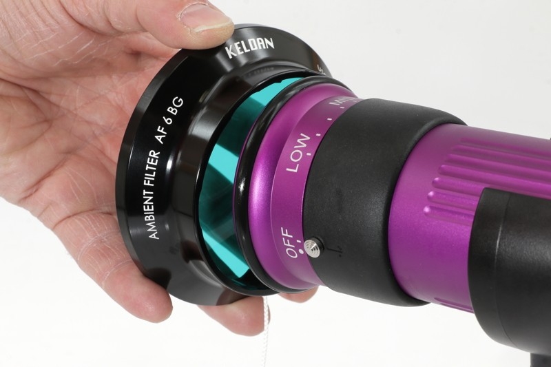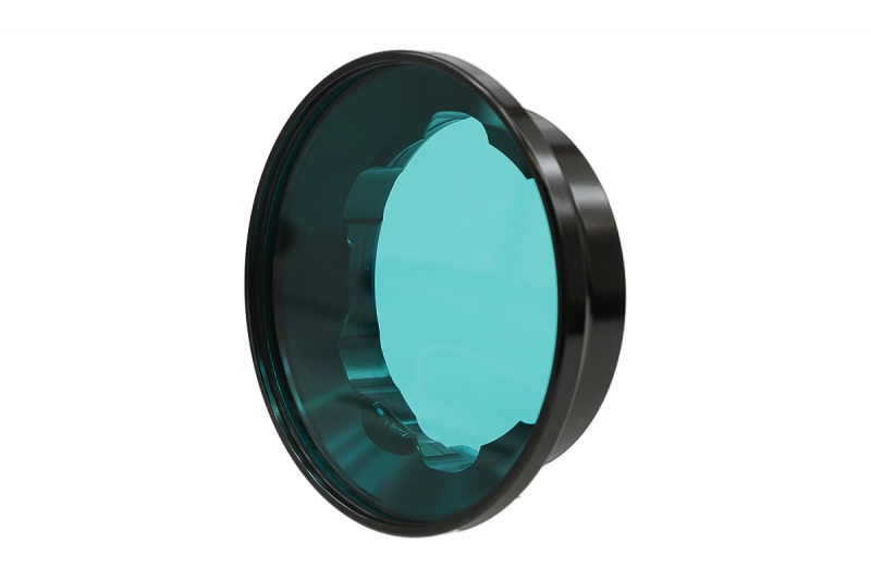 Der Umgebungsfilter AF 6 BG wandelt das weiße Videolicht in blaugrünes Umgebungslicht um, das einer Wassertiefe von etwa 6 m entspricht.