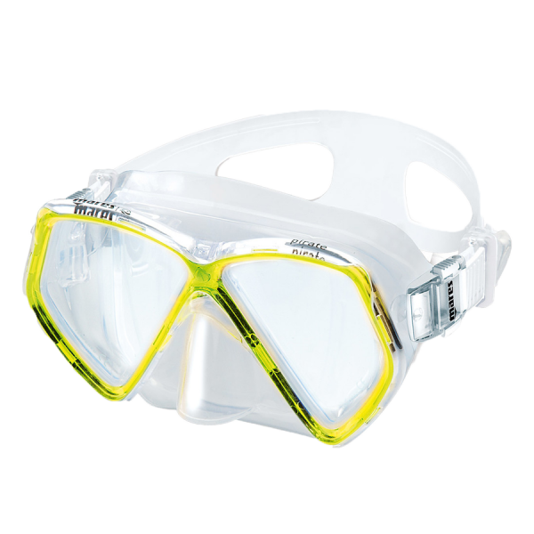 Maske - Junior - Pirate Schnorchelmaske Pirate für Kinder mit zwei Gläsern und breiter vertikaler, horizontaler und peripherer Sicht. Schnallen mit EZ Adjust-Technologie für schnelle und einfache Einstellung. Widerstandsfähig und leicht. Maskenkörper aus Silikon.