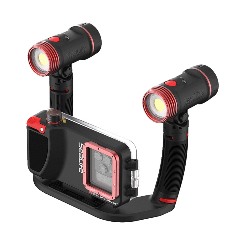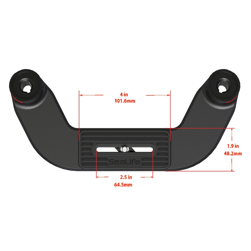 Der bogenförmige Doppelträger bietet eine ideale Passform für den SeaLife SportDiver und andere breite Unterwasserkameragehäuse. Befestige zwei Blitze oder Lichter an Ihrer Unterwasserkamera, um die Helligkeit zu verdoppeln und Rückstreulicht und Schattenbildung zu reduzieren. Der Träger kann mit Griffen und Lichtern hinter dem Gehäuse oder vor dem Gehäuse ausgerichtet werden. Das Halten der Kamera mit zwei Griffen erhöht die Stabilität. Robuste Polycarbonat-Konstruktion für zuverlässige Haltekraft und Steifigkeit. Zum Anbringen an jede Kamera mit einem Standard-1⁄4-20-Tripod-Schraubgewinde. Zwei 1⁄4-20-Gewindebuchsen befinden sich unter dem Träger, um ein Objektivdock oder andere Zubehörteile hinzuzufügen.