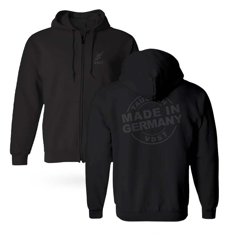 "VDST-Hoodie in schwarz oder grau mit aufgesticktem VDST-Logo vorne und großem ""Tauchen Made in Germany"" Logo hinten. Extrem robuster, leichtgängiger, teilbarer YKK Profil-Marken-Reißverschluss mit Voll-Metall-Puller, Ton in Ton, passend zum Hoodie. Von Doppelnähten gehaltener, farblich abgestimmter, Bund. Exzellente Passform, professionelle Verarbeitung und das fantastische Preis-Leistungs-Verhältnis, kennzeichnen den originalen ido Marken Zip-Up Hoodie – absolut etwas für coole Zeiten! Gefertigt aus feinsten Garnen, mit einem Gewicht von ca. 320 g/qm ist der Hoodie angenehm und superweich zu tragen. Rippenstick an Ärmel und Bund, abgenähte, links und rechts aufgesetzte Känguru-Eingriffstaschen sichern Ihnen einen hohen Tragekomfort. 65% Baumwolle 35% Polyester"