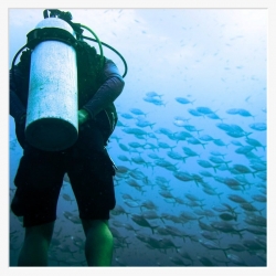 Je nach Größe der Tauchflasche passen 2 bis 3 Kubikmeter Luft hinein. Das kommt in etwa dem Volumen einer Telefonzelle gleich. Normalerweise befinden sich in einer Flasche etwa 180-200 bar. Ist eine 10-Liter-Flasche also mit 200 bar gefüllt, dann entspricht das 2000 Liter Luft.